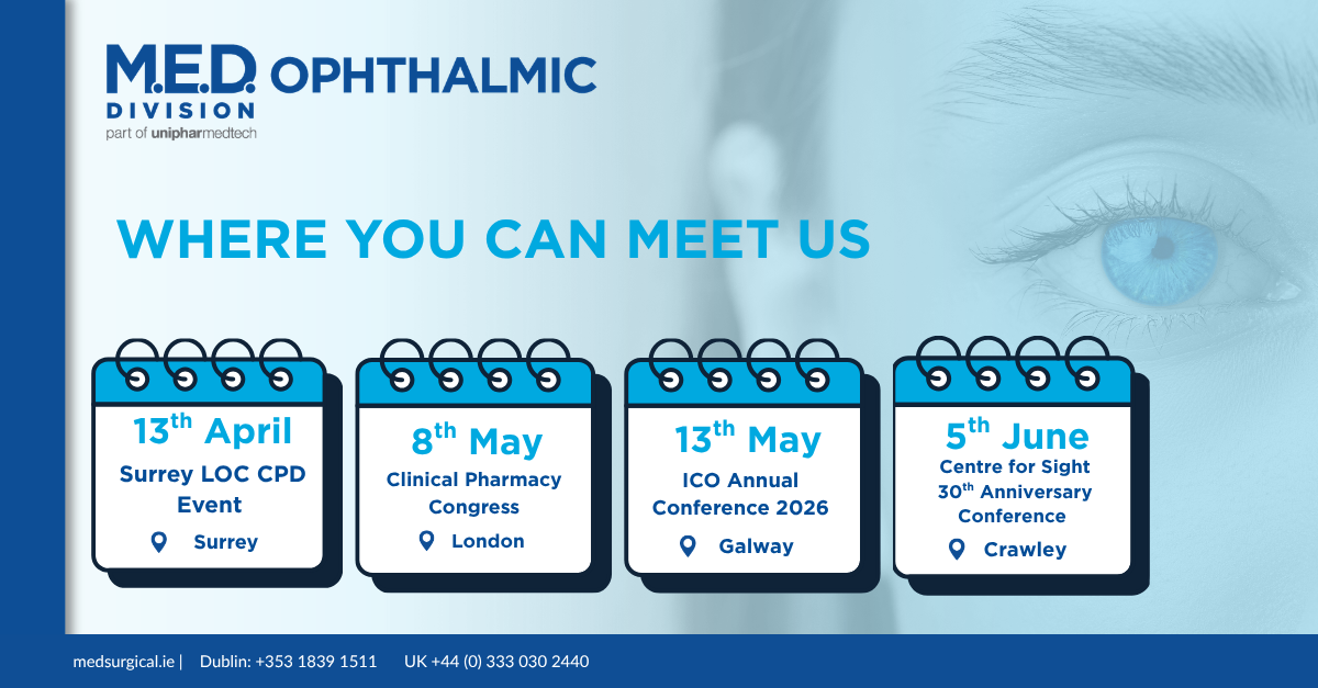 The M.E.D. Surgical Ophthalmic Division is pleased to share our upcoming schedule of events for Q2 2026. Throughout the quarter, our specialist team will be exhibiting at a range of leading ophthalmology conferences and professional meetings across the UK and Ireland.